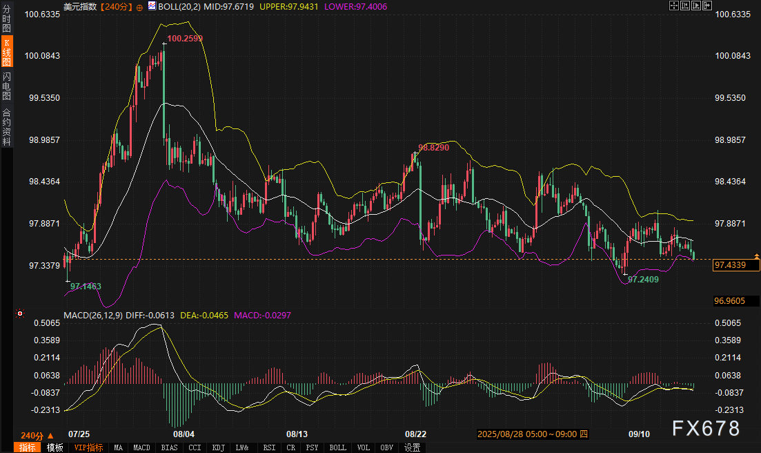 技术层面,美元指数在240分钟图上徘徊于布林带下轨97.4018上方,显示即时支撑。中轨97.6719转为潜在阻力,MACD的DIFF与DEA线分别位于-0.0610和-0.0463,柱状线趋平,暗示熊势动能减弱。价格在97.1463低点与97.9375高点间震荡,形成盘整格局。支撑区间97.15-97.40若失守,可能引发进一步下探;反之,突破97.65-97.95阻力将确认反转信号。日内交易者可留意97.40关口的反弹迹象,尤其在美联储前夕,债市收益率的微调往往先行指引美元方向。