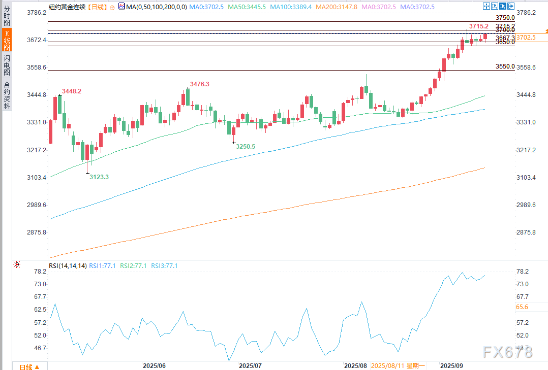 从技术角度来看,12月黄金期货多头在整体近期技术层面拥有强大优势。多头的下一个上行价格目标是收于3750美元/盎司的强劲阻力位上方。空头下一个近期下行价格目标是将期货价格推低至3550美元/盎司的强劲技术支撑位下方。首个阻力位在3700美元/盎司,然后是本周合约高点3715.2美元/盎司。首个支撑位是隔夜低点3662.8美元/盎司,然后是3650美元/盎司。