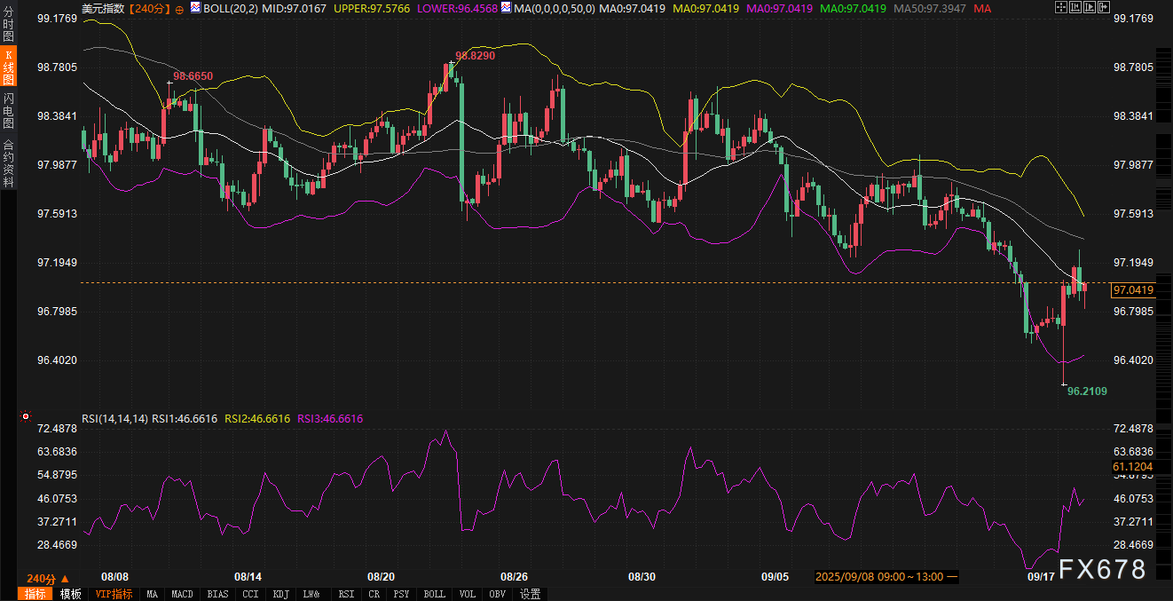 美联储降息路径是美元走势的核心变量。9月降息25个基点已部分消化,市场预期11月或12月再降25-50个基点。若降息节奏符合预期(累计50-75个基点),美元指数可能下探至98-100区间;若超预期(如75个基点以上),可能跌破98,测试95.80的第二支撑位。季度末流动性收紧(如SRF使用量激增)可能短暂推高美元融资成本,支撑DXY在9月底测试102-103。然而,全球央行(如欧元区、日本)同步宽松可能维持美元相对吸引力,限制其下行空间。