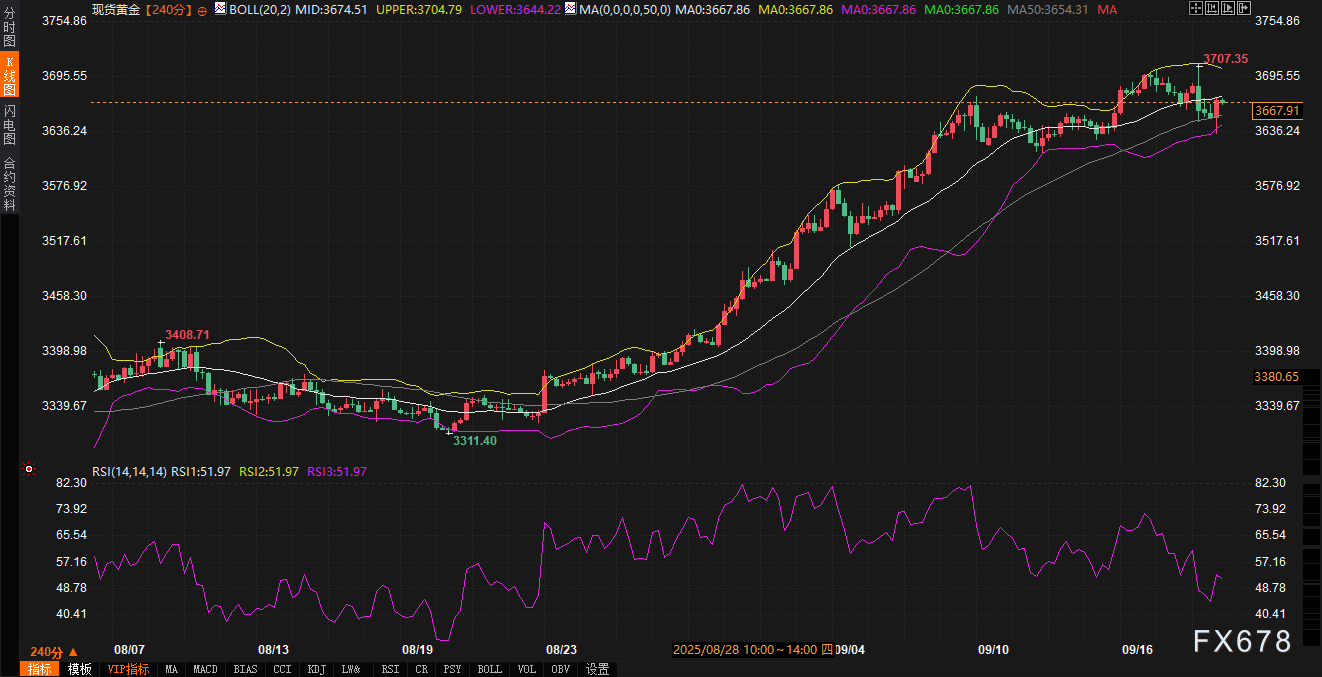 黄金当前在3644-3704区间内震荡,关键支撑3650(50均线+心理位)与阻力3700(整数位+布林上轨)构成交易框架。若站稳3670(中轨与50均线重合区),可能测试3700;若跌破3650,则可能回探3644(布林下轨)。突破需RSI脱离50-60中性区域,并伴随美元指数的负相关性强化。交易员需关注纽约时段金价对美元波动的敏感性,以及美国国债收益率曲线的动态变化。