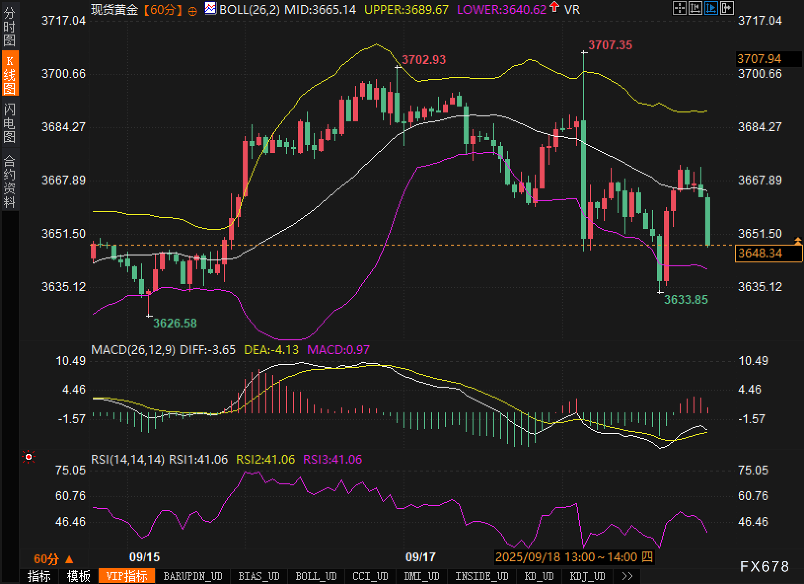从小时图(60分)观察,布林带中轨在3665.14,上轨3689.67,下轨3640.62。价格在昨日冲击3707.35高点后回落,当前围绕3640附近盘整,位置介于下轨与中轨之间,表明短线仍处“弱势反弹—均值回归”阶段。布林带带宽约50美元,波动性处于中高位,尚未出现典型“带宽收缩”信号,趋势性延展需新的动能确认。