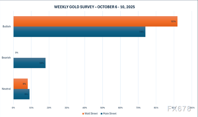 Kitco新闻周度黄金调查显示,华尔街92%的分析师看涨未来一周金价,大众投资者74%持乐观态度。