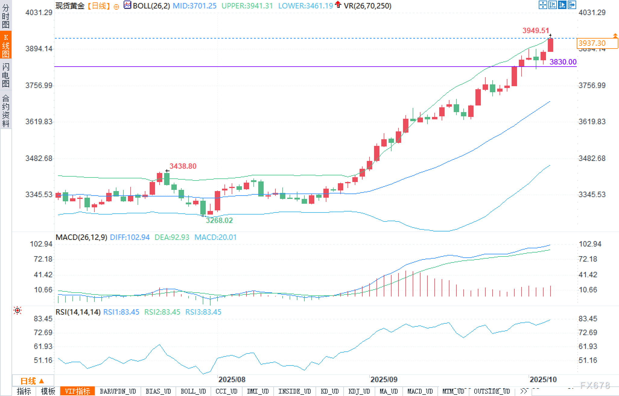 综合判定:日线趋势明确向上,短线若出现贴轨加速后的“回撤—回测—再启”节奏,3830.00美元与布林上轨附近将形成动态支撑共振;若持续站稳3941.31美元上方并延续沿轨,历史高点3949.51美元的上破与扩展并不意外,但需警惕超买区间的快速拉回。